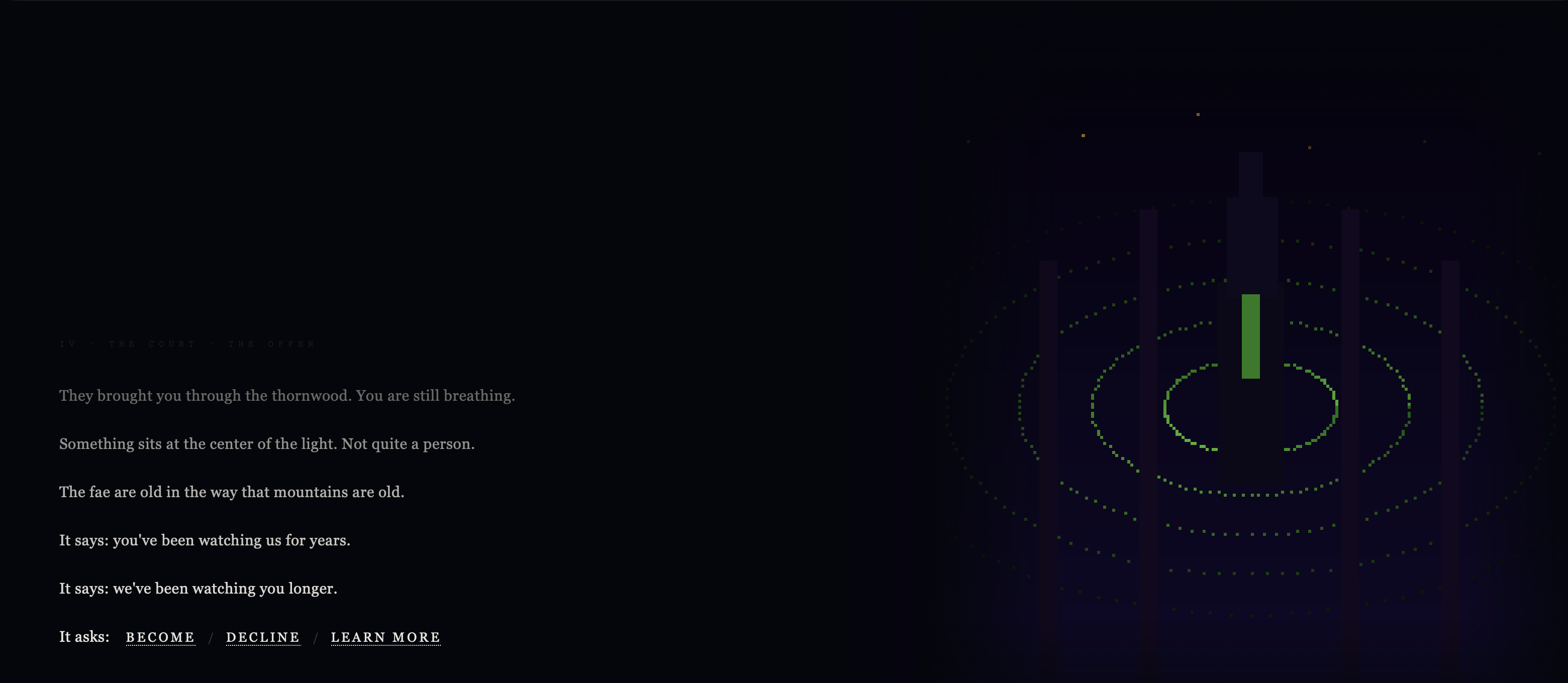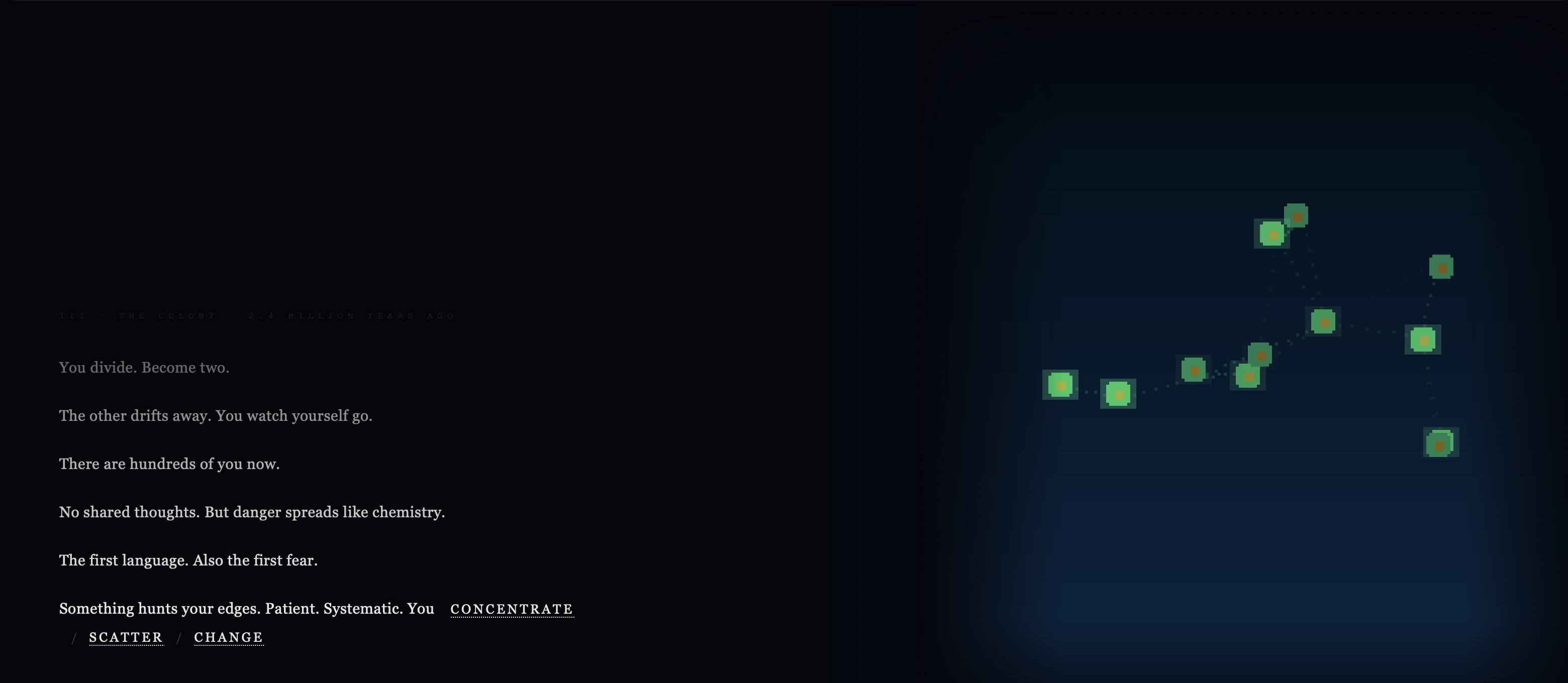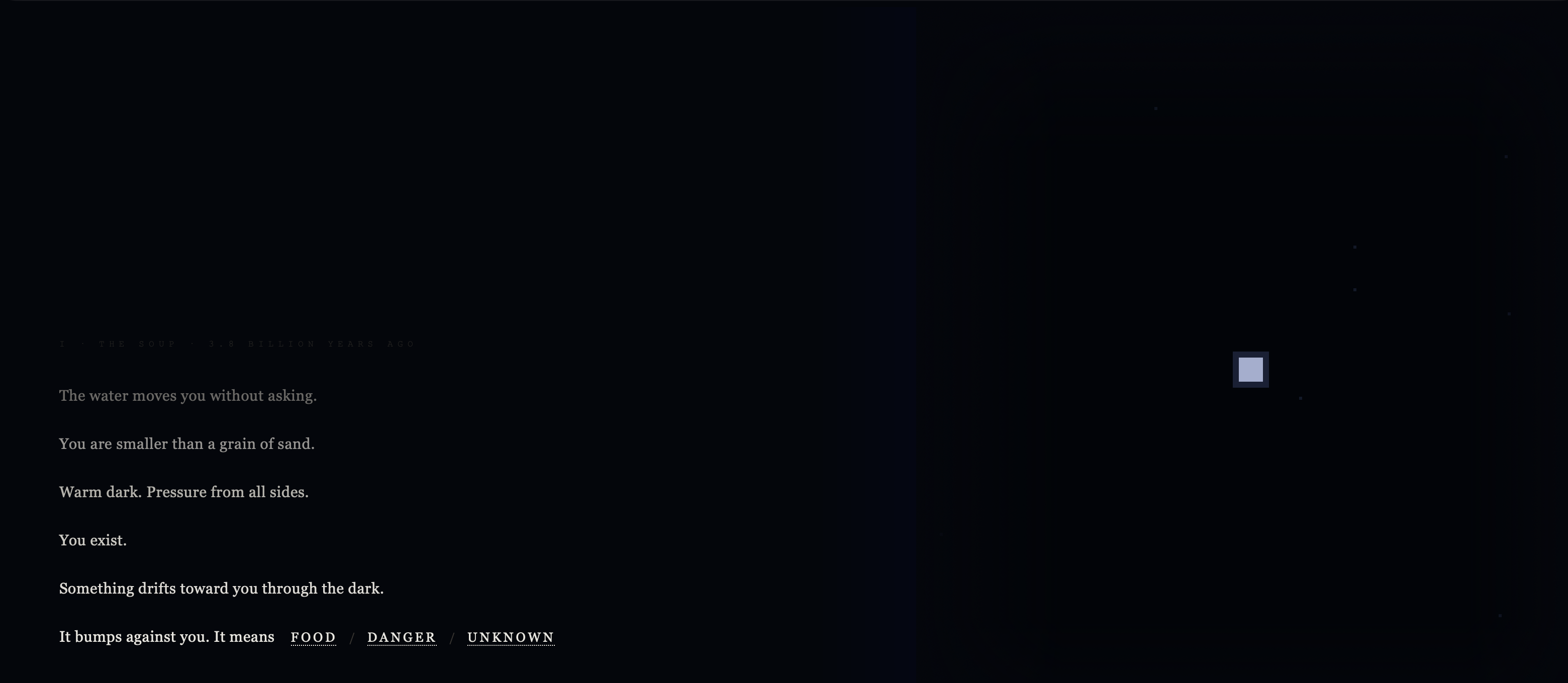 Primordial is a text adventure about living every life between then and now. You divide. You drift. You grow a body and learn to use it. You haul yourself onto land, which is heavier than water and more honest about gravity.