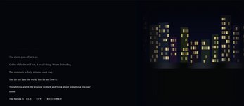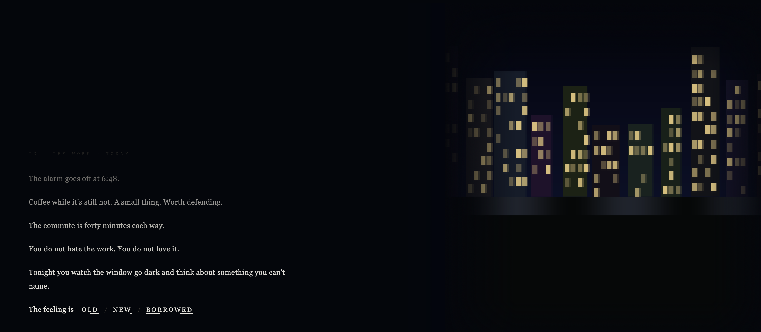 Eventually you wake to an alarm, drink coffee before it gets cold, sit in traffic, eat dinner while watching the window go dark.